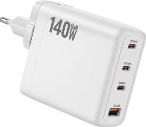 Cargador GO SOLID! 140W compacto con 4 puertos (3× USB-C, 1× USB-A). Carga rápida con Power Delivery y compatibilidad Quick Charge para teléfonos, tablets y portátiles. Distribución inteligente de potencia para cargar varios dispositivos simultáneamente a la velocidad óptima. Protecciones frente a sobrecorriente, sobretensión y cortocircuito para una carga segura. Diseño portátil y ligero, ideal para casa, oficina y viajes. Compatible con Apple, Samsung, Google, Huawei, Xiaomi, OnePlus, Dell, HP y Lenovo.