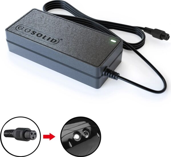 Cargador GO SOLID! de repuesto para hoverboard Denver BDO-6501. Salida: 42V 2A. Diseño compacto y resistente con indicador LED y cable de carga duradero — ideal como cargador de repuesto. Conexión fácil para carga rápida. Compatible con Denver.