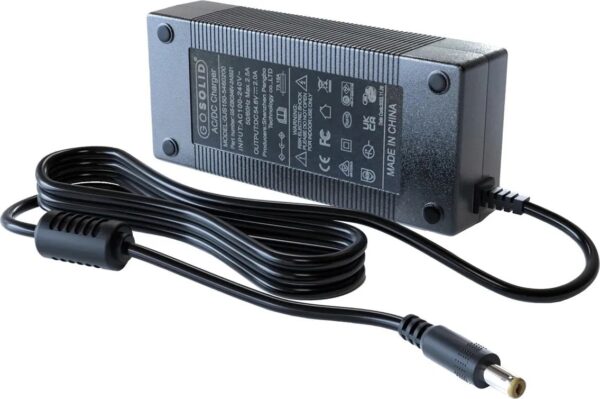 Cargador de repuesto GO SOLID! para bicicleta eléctrica, compatible con Lankeleisi. Compatible con los modelos MG600 Plus y RX800 Plus. Diseño compacto y ligero para facilitar el transporte y almacenamiento. Protecciones integradas contra sobrecalentamiento, sobrecorriente y cortocircuito para una carga segura. Excelente como cargador de recambio o adicional.