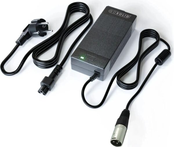 Cargador de repuesto GO SOLID! para bicicletas eléctricas Ridstar Q20, Q20 Lite y Q20 Pro. Compatible con Ridstar. Cargador compacto y eficiente que ofrece carga estable con protección integrada contra sobrecorriente y cortocircuito. Incluye cable de carga para una conexión fácil. Ideal como repuesto o cargador adicional, optimizado para accesorios electrónicos.